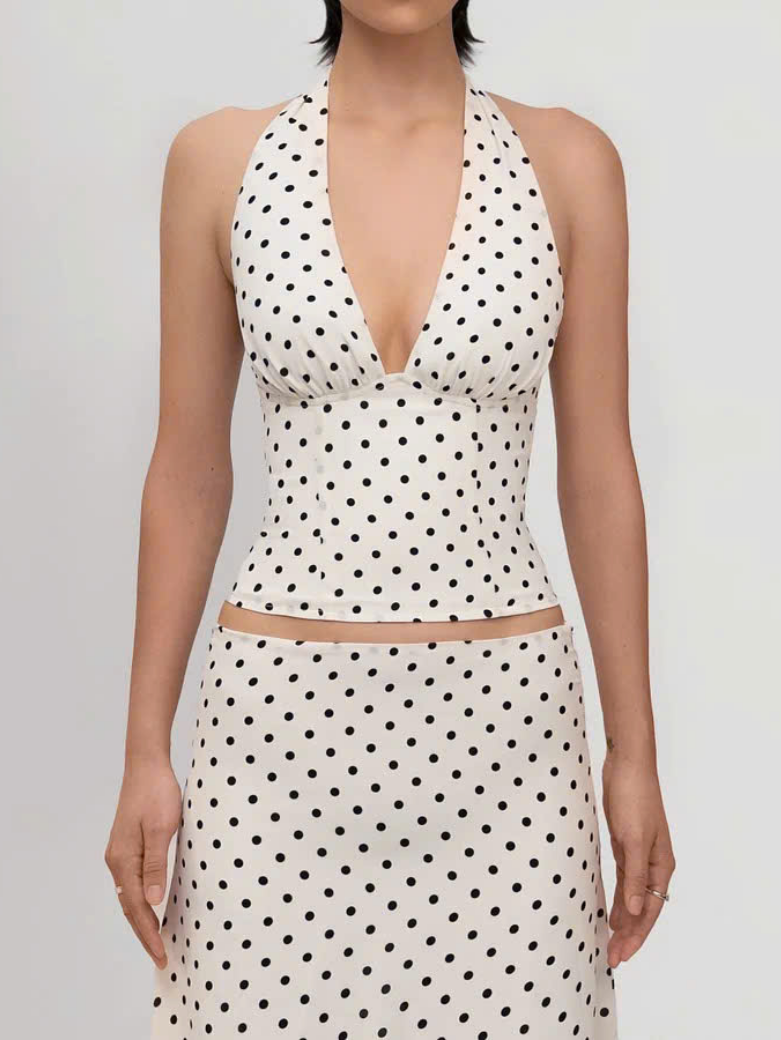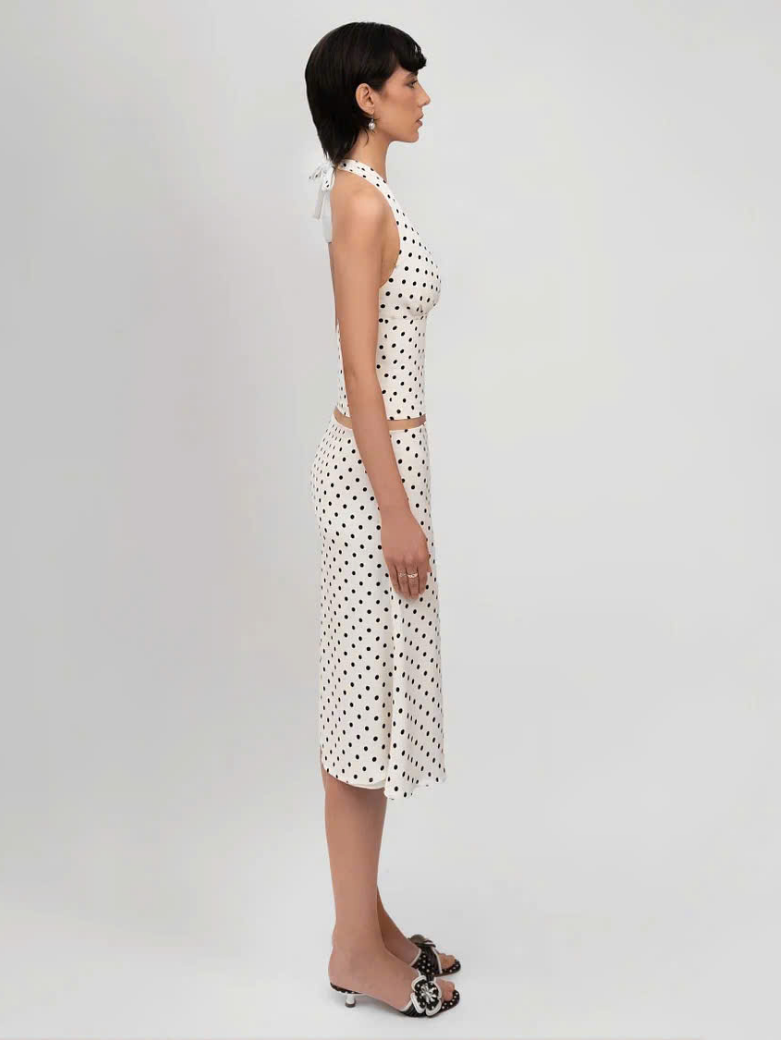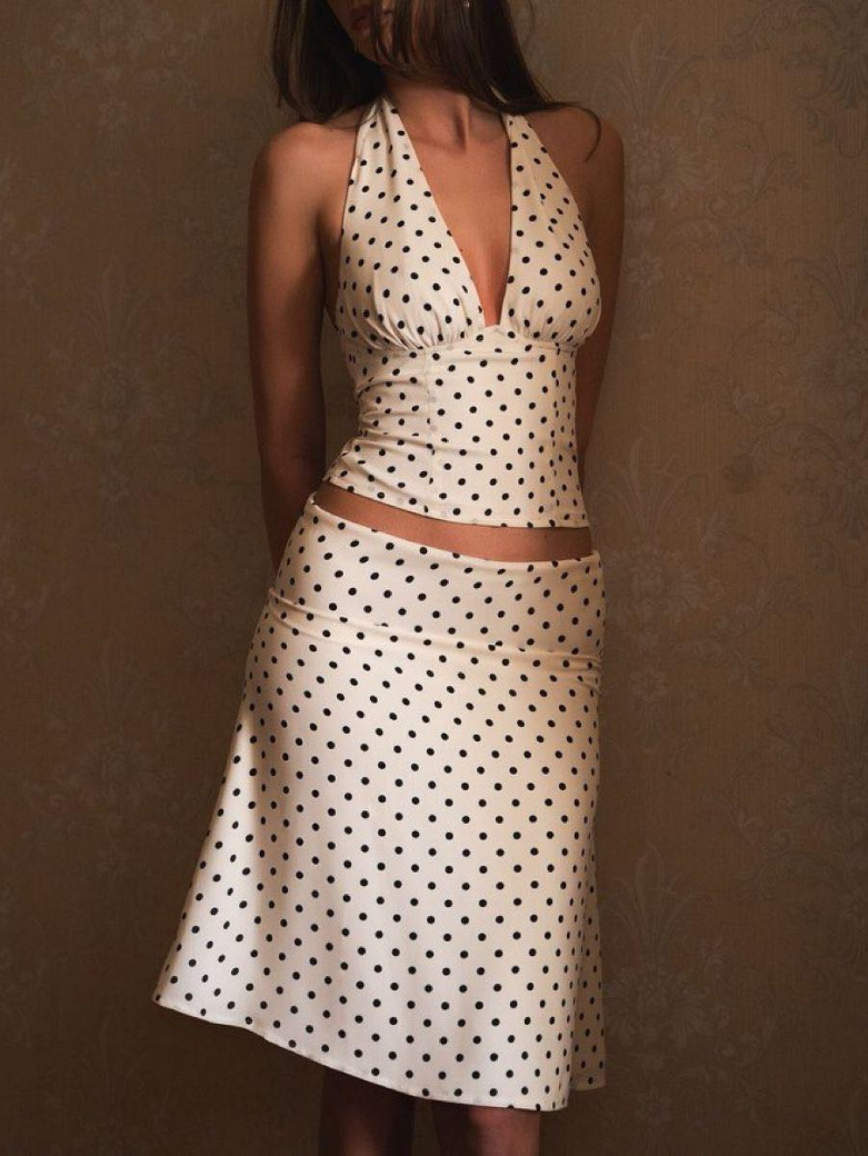 Polka Dot Satin Set gồm áo yếm cổ sâu hở lưng và chân váy midi dáng chữ A, tạo hiệu ứng đường cong mềm mại và tôn lên nét thanh thoát của cơ thể.
