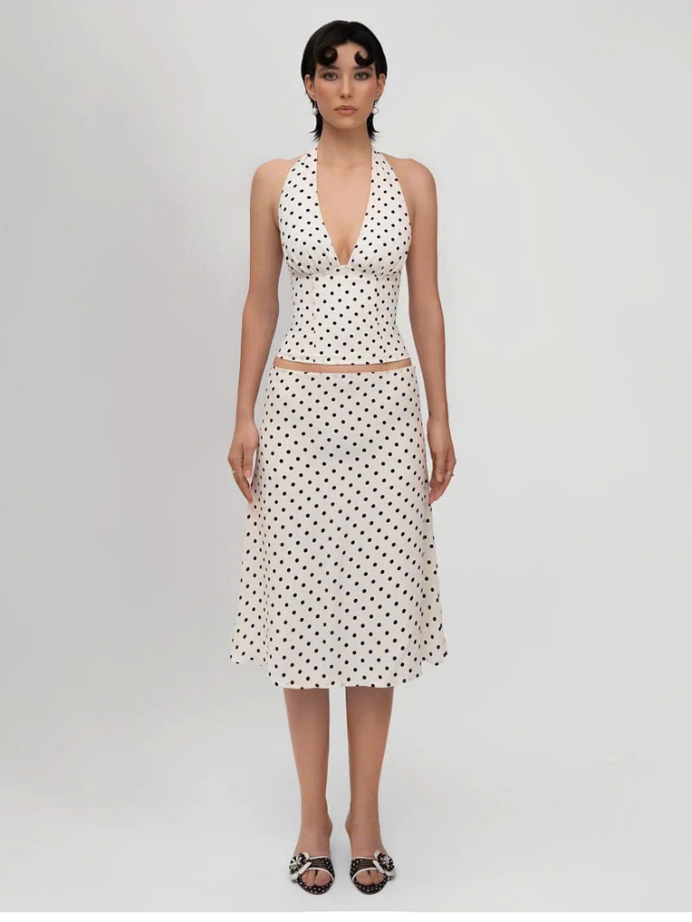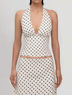 Polka Dot Satin Set gồm áo yếm cổ sâu hở lưng và chân váy midi dáng chữ A, tạo hiệu ứng đường cong mềm mại và tôn lên nét thanh thoát của cơ thể.